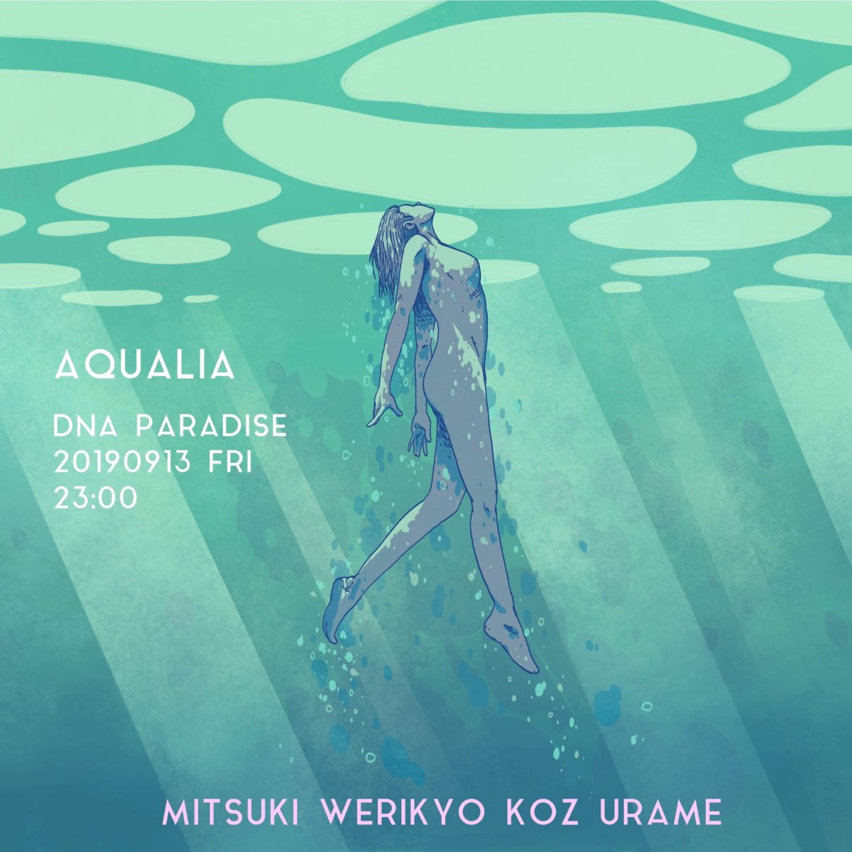 AQUALIA イベント詳細 日付: 9月-13-19 23:00 – 14-19 05:00 カテゴリ: crossover, deep house, Techno 2019.09.13(fri) AQUALIA DNA Paradise music charge 1000yen 22:00 Mitsuki((mole music)) Werikyo (from Kobe) Koz Urame Deep House.Crossover.Techno