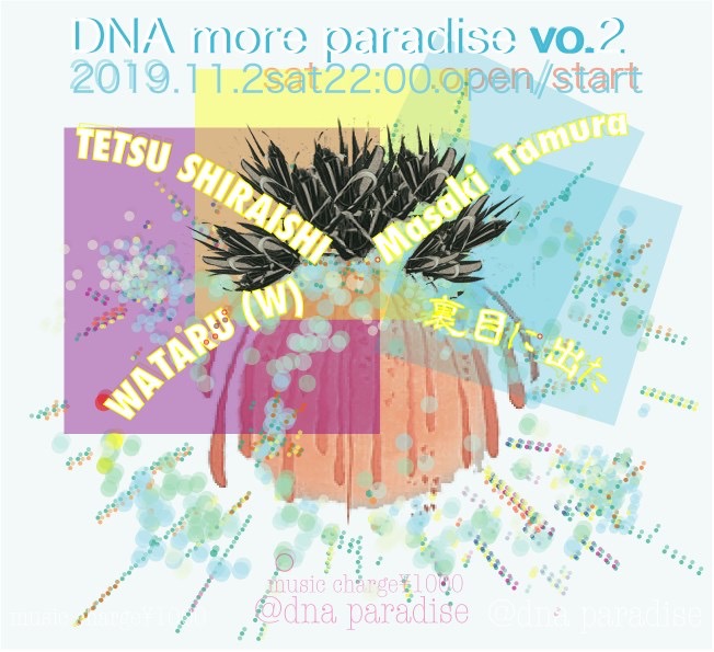 DNA more paradise vol.2 イベント詳細 日付: 11月-02-19 22:30 – 03-19 05:00 DNA more paradise vol.2 2019.11.2sat22:00~ djs; TETSU SHIRAISHI Masaki Tamura WATARU(W) 裏目に出た music charge¥1000