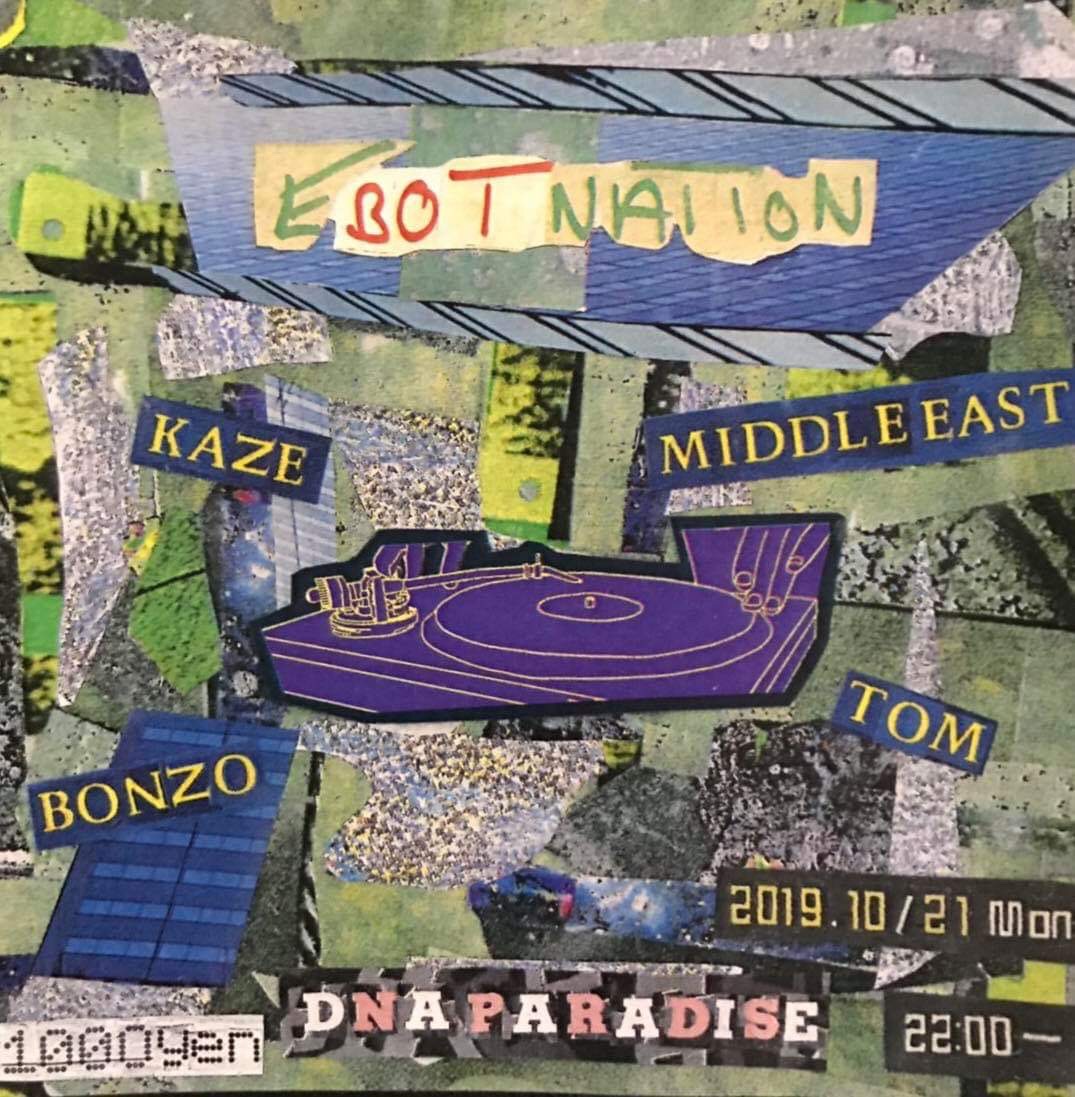 E BO T NATION イベント詳細 日付: 10月-21-19 22:00 – 22-19 05:00 E BO T NATION 2019 10/21 mon 22:00〜 1000 yen @DNAPARADISE DJ KAZE MIDDLE EAST TOM BONZO