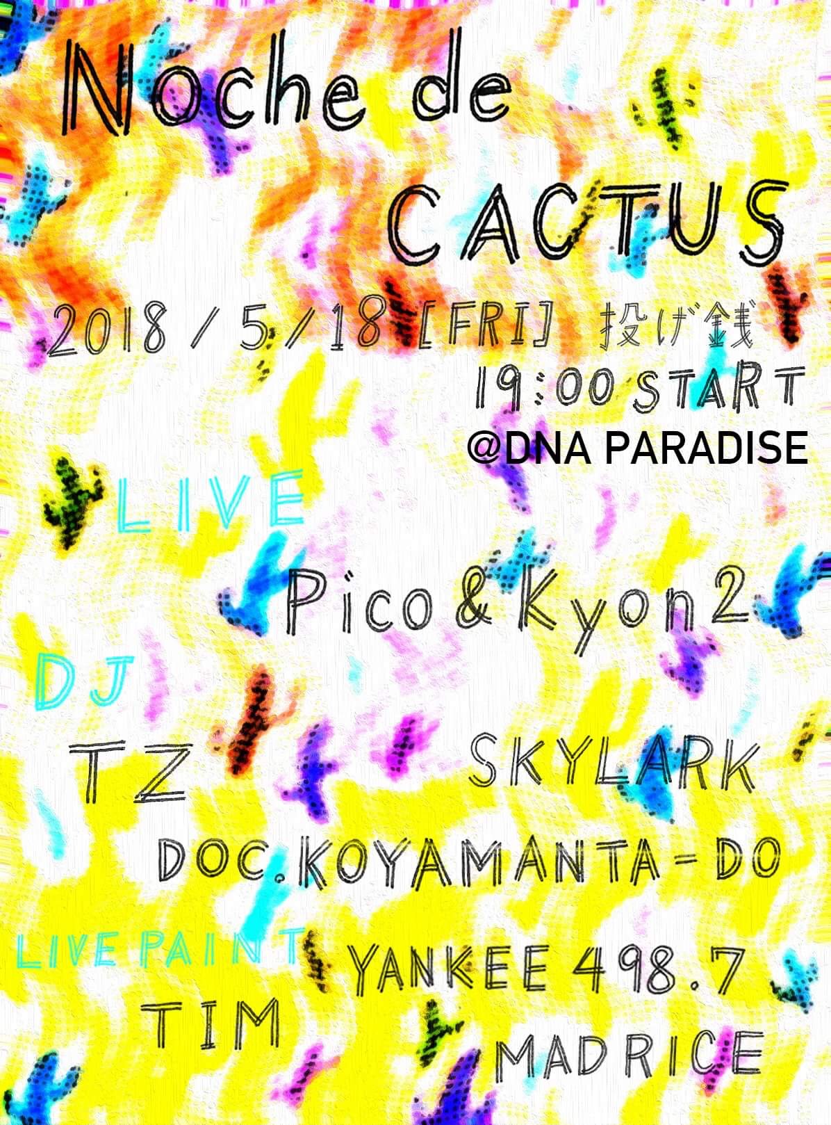 Noche de CACTUS イベント詳細 日付: 5月-18-18 19:00 – 19-18 00:00 投げ銭 19:00start live: Pico&Kyon2 dj: TZ SKYLARK DOC.KOYAMANTA- DO paint: YANKEE498.7 TIM MADRICE