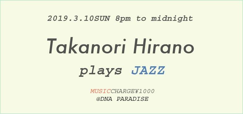 Takanori Hirano plays Jazz イベント詳細 日付: 3月-10-19 20:00 – 11-19 00:00 カテゴリ: jazz Dj: Takanori Hirano music charge¥1000 Takanori Hirano plays jazz, open to last longset!