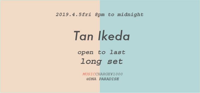 Tan Ikeda open to last longset イベント詳細 日付: 4月-05-19 20:00 – 06-19 00:00 Tan Ikeda open to last longset 2019.4.5fri8pm〜 DJ:Tan Ikeda music charge¥1000