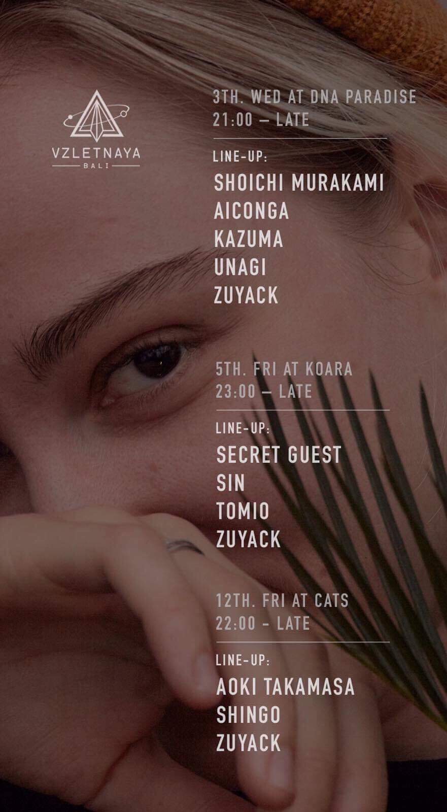 VZLETNAYA Bali Takeover vol’2 イベント詳細 日付: 4月-03-19 21:00 – 04-19 02:00 カテゴリ: house, Techno VZLETNAYA Bali Takeover vol’2 3th. Wed at Dna. Kyoto 21:00 – late Shoichi Murakami Aiconga Kazuma Unagi Zuyack