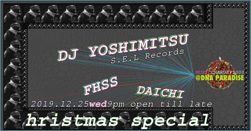 X’mas special イベント詳細 日付: 12月-25-19 21:00 – 26-19 03:00 カテゴリ: crossover, house, jazz X’mas special DJ Yoshimitsu(S.E.L. Records) Daichi Fhss 21:00-till late music charge 1000yen